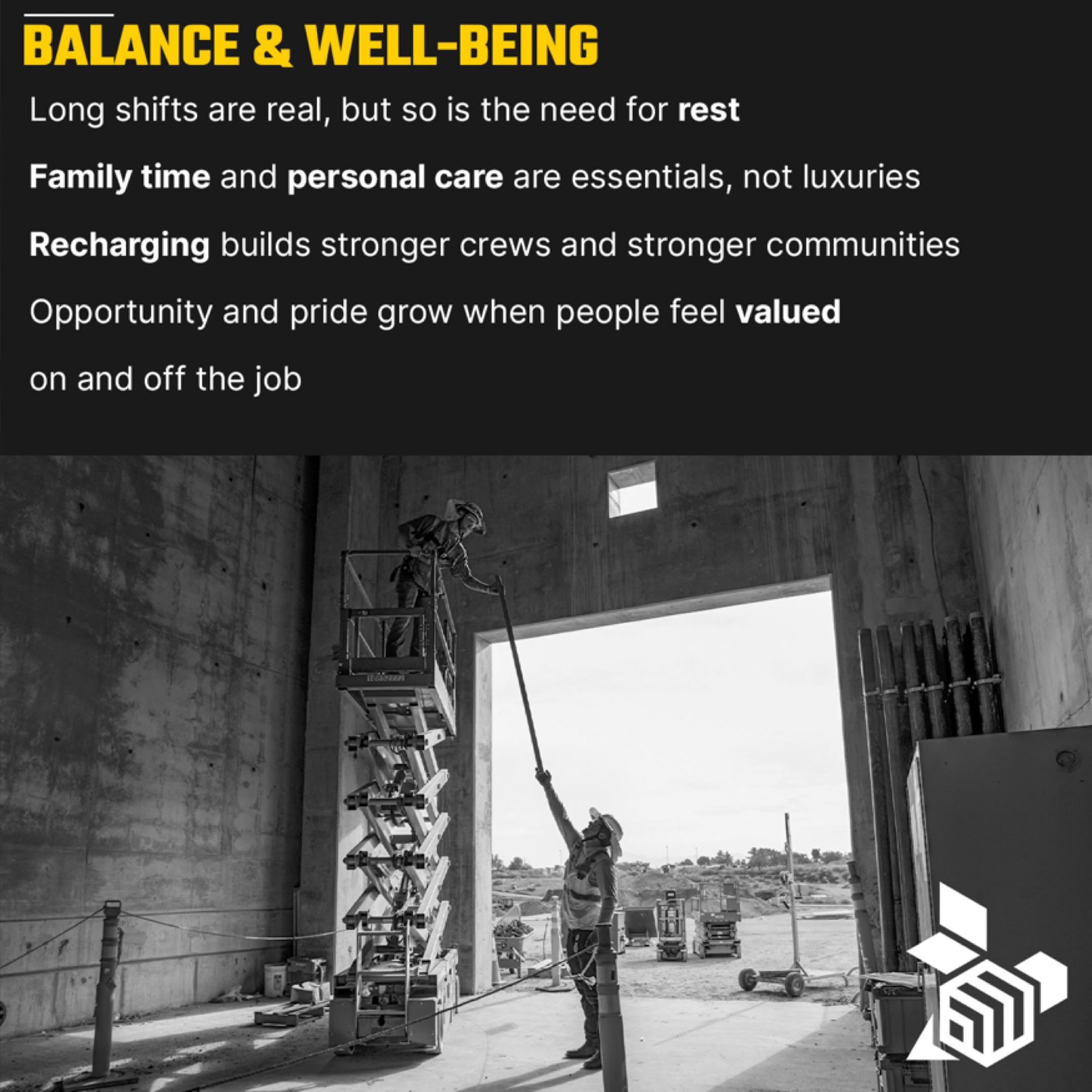 Early mornings, long shifts, and overtime are part of the reality in the construction industry. At the same time, we know balance matters. We emphasize the importance of rest, family time, and personal care as essentials, not luxuries. This isn’t about limiting hours, but about reminding our craft that we value them as people, not just employees. When people have the space to recharge, they show up stronger as teammates, leaders, friends, and family members.